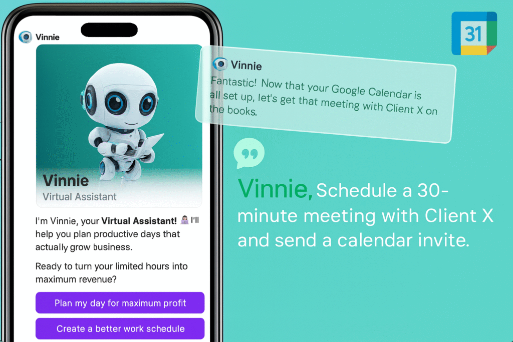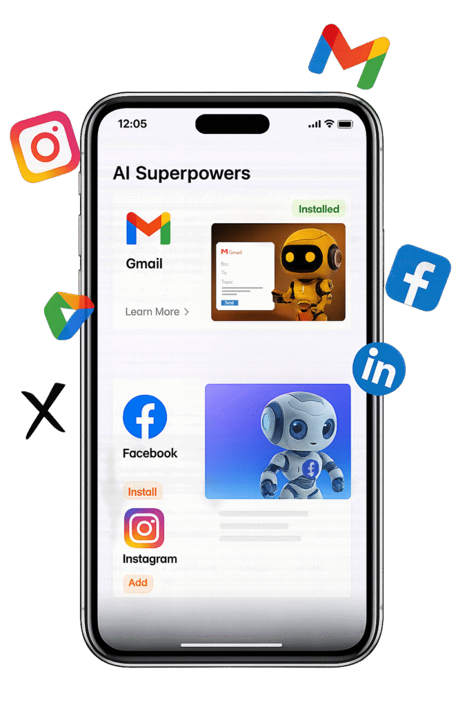 Works with Gmail, Google Drive, Calendar, Instagram, X, LinkedIn & more.